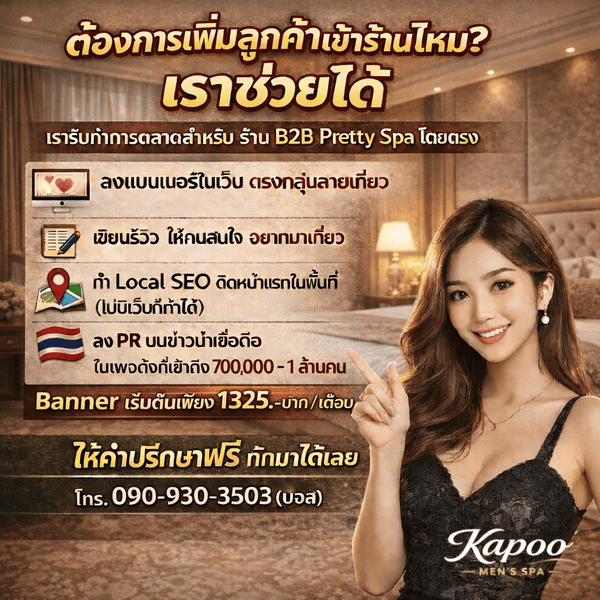 ทางเรามีบริการโฆษณา หรือลงโปรโมทร้าน นวดพริตตี้ Pretty Spa B2B ให้เข้าถึงลูกค้าใหม่ๆ ทางออนไลน์ ด้วยบริการที่หลายแบบ ตามที่ต้องการ